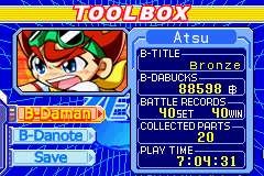 Battle B-Daman ReviewHello everyone, and I am linkmaster99, as you all know. I will be reviewing a game called Battle B-Daman. Well I had this game on my Visual Boy Advance, and when I started to play this, I ended up completing it. It wasn't to hard, but it was extremely fun. I really enjoyed playing through this awesome game, and I decided to do it again on vizzed. Well I haven't beaten it yet on the site, but that is yet to be foretold. I will, and I am here to get you guys interested. I hope you all enjoy, so let me get started with my review ;).